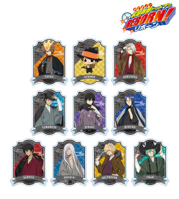沢田 綱吉、リボーン、獄寺 隼人、山本 武、雲雀 恭弥、六道 骸(10年後)、XANXUS(10年後)、スペルビ・スクアーロ(10年後)、ベルフェゴール(10年後) 、フランの描き下ろしイラストをアクリルバッジに仕上げました。