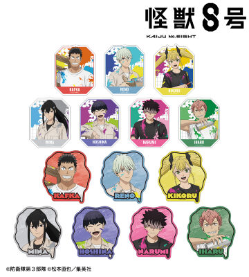 日比野カフカ、市川レノ、四ノ宮キコル、亜白ミナ、保科宗四郎、鳴海弦、古橋伊春の描き下ろしイラストをダイカットのステッカーに仕上げました。