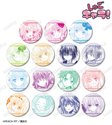 日奈森 あむ、アミュレットハート、アミュレットスペード、アミュレットクローバー、アミュレットダイヤ、月詠 イクト、辺里 唯世、藤咲 なでしこ、相馬 空海、結木 やや、真城 りま、三条 海里、藤咲 なぎひこ、ほしな 歌唄の原作コマイラストを缶バッジに仕上げました。