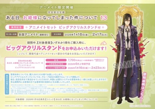 【販売期間:2026年2月17日(火)23:59まで】【ビッグアクリルスタンド申込期間:2026年2月23日(月)23:59まで】完全受注生産・ビッグアクリルスタンドについては、グループ会社・ムービックの通販機能を使用し、後日、指定住所まで発送させていただきます。申請に必要なシリアルを書籍本体と一緒に発送いたしますので、申込期間内にお客様の方で必要事項の登録などをお願いいたします。※完全受注生産部分の発送手配にはムービック通販アカウントが必要となります(登録無料)。 詳しくは、下記HPをご確認ください。・https://www.movic.jp/shop/customer/authmail.aspx※シリアルは所定のWEBページで登録が終了するまで大切に保管をお願いします。 紛失されても再発行は致しかねます。※購入後、転居などにより発送先を変更されたい場合は、 ムービック通販HP マイページにて【出荷準備が開始される前】までに、情報の変更をお願いいたします。※通販購入の場合、重要事項説明書のお渡しはございません。 当ページ記載の注意事項ならびに下記項目をご了承の上、ご購入ください。・配送について、株式会社ムービックが担当すること、ムービック通販上での手続きが必要であること・発送先登録にあたり、ムービック通販アカウントの登録が必要であること・配送の際に外装箱の汚損その他瑕疵については返品対象にならないこと・商品本体の不良ではない、配送上のトラブルについて、輸送会社対応となること・個人情報は、㈱アニメイトおよび㈱ムービックの個人情報保護指針に則り管理すること および スムーズな商品配送のため、必要に応じて個人情報を㈱ムービックと共有すること・お客様の手続き不備などで商品がお届けできなかった場合、再配送はお客様が費用負担する場合があること*===========*===========*===========*===========*アニメイトセット仕様:ビッグアクリルスタンド購入用シリアル付き※下記商品が「お取り寄せ」「販売終了」になりますと、 こちらの商品ページのカートボタンが「カートに入れる」であっても、 「お取り寄せ」や「購入不可」となる場合がございます。・【コミック】ある日、お姫様になってしまった件について(13)*===========*===========*===========*===========*//////////////////////////////////////////////////////////////////////////////////※下記ご注文例にてご購入いただいた場合、 申込期間に間に合わない場合がございます。予めご了承の上、ご注文をご検討下さい。・「お取り寄せ」や「通常○~○日以内に入荷」でのご注文・「お取り寄せ」や「通常○~○日以内に入荷」の商品と同梱でのご注文・発売日以降出荷、商品追加入荷待ちでのご注文・決済手続き・ご入金確認のタイミングにより、発送時期が遅れる場合・お客様ご不在により、荷物が持ち戻りされた場合・その他、不測の事態により商品の発送が遅延する場合//////////////////////////////////////////////////////////////////////////////////