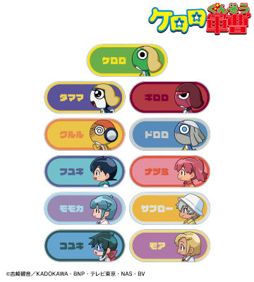 ケロロ、タママ、ギロロ、クルル、ドロロ、日向 冬樹、日向 夏美、西澤 桃華、サブロー、東谷 小雪、アンゴル・モアが歩いているちびキャラを新たに描き起こし、アクリルネームプレートに仕上げました。