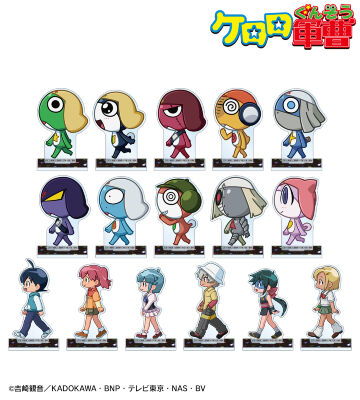 ケロロ、タママ、ギロロ、クルル、ドロロ、ガルル、タルル、トロロ、ゾルル、プルル、日向 冬樹、日向 夏美、西澤 桃華、サブロー、東谷 小雪、アンゴル・モアが歩いているちびキャラを新たに描き起こし、アクリルスタンドに仕上げました。