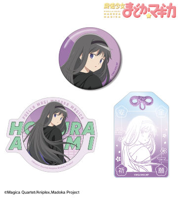 暁美ほむらの描き下ろしイラストを、アクリルお守り、缶バッジ、ステッカーの3点セットにまとめ、キャラクターの魅力あふれる、ジッパー付きの袋に入った、プレゼントやお土産にも使えるセットに仕上げました。